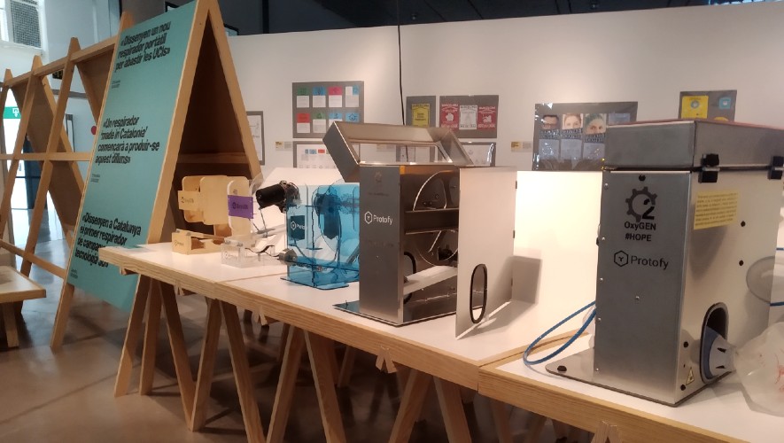 Diveros models del respirador 'OxyGen' en ordre d'evolució. | Foto: Helena Martín 2. RespiradorUn dels dissenys més cridaners de l'exposició és el del respirador 'OxyGen' de l'equip d'enginyers Protof, del qual en podem veure l'evolució de creació: des del que van construir en dos dies fins al que va ajudar a respirar a un pacient el 20 d'abril a Can Ruti. Segons explica Ignasi Plaza de Protofy, en veure la falta de respiradors als hospitals catalans, el seu equip d'enginyers es va posar a dissenyar un respirador del qual en van fer disset versions. En el primer model, explica l'enginyer, van haver d'arrencar les parets de fusta de l'oficina per tenir material per a construir-lo. Tal com està escrit a una paret de l'exposició en lletres grans: "El disseny et pot salvar la vida".