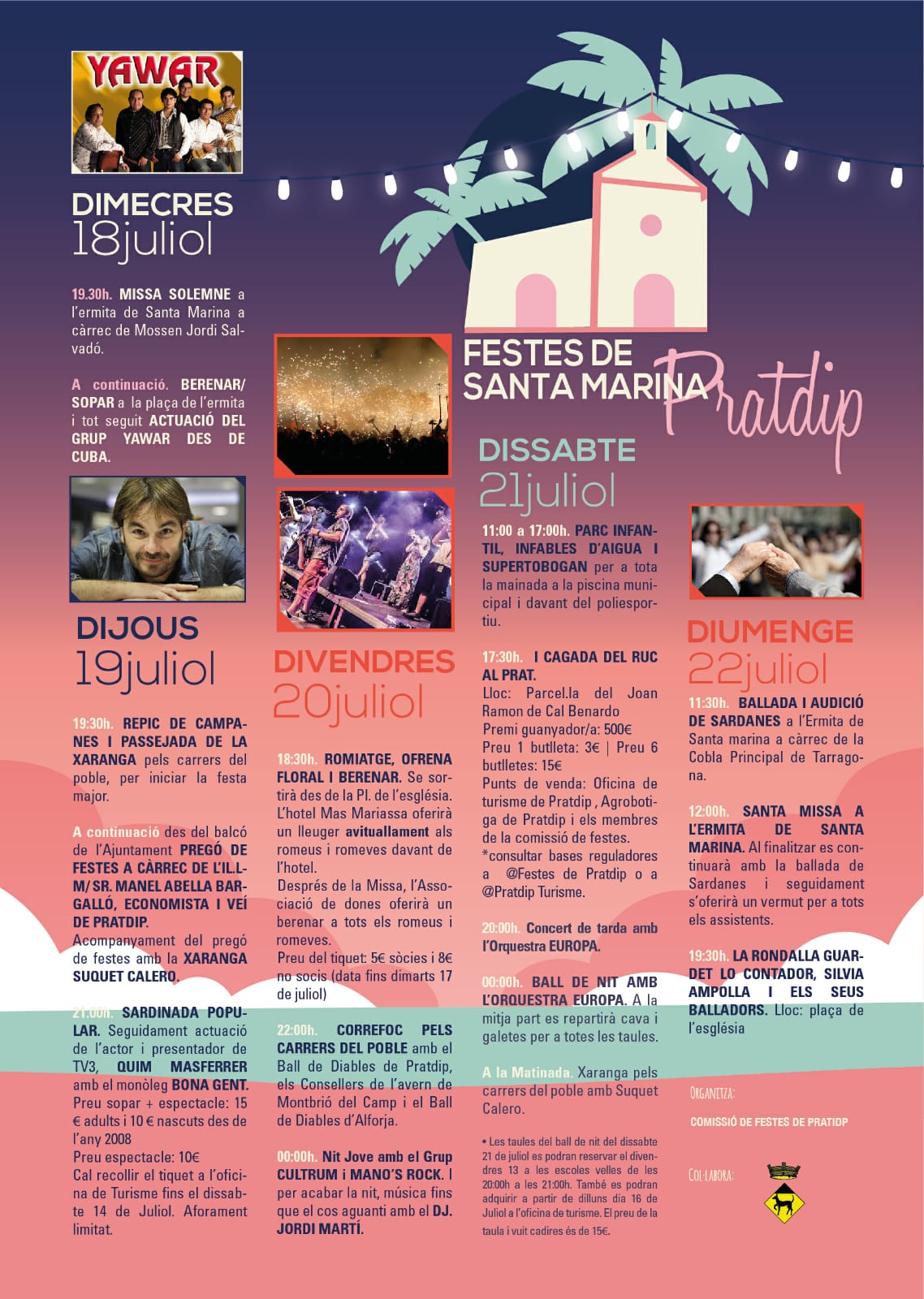 La localitat de Pratdip celebra un any més les festes de Santa Marina. Enguany el pregó anirà a càrrec de l'economista Manel Abella Bargalló, i els asistents a la festa podràn gaudir amb el monòleg d'en Quim Masferrer, el tradicional correfoc o la revetella de Festa Major amb l'orquestra Europa.