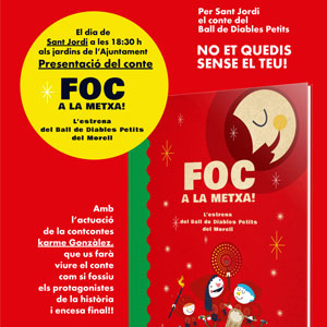 En el marc de la celebració de la Diada de Sant Jordi, presentació del llibre 'Foc a la metxa!'. Es tracta d'un conte de l'Associació Cultural Embruix sobre el Ball de diables petits del Morell. L'ha escrit Ramon Gasull, i la il·lustració ha anat a càrrec de Debonatinta. Aquest acte, a més, comptarà amb una contacontes i hi haurà una encesa final.