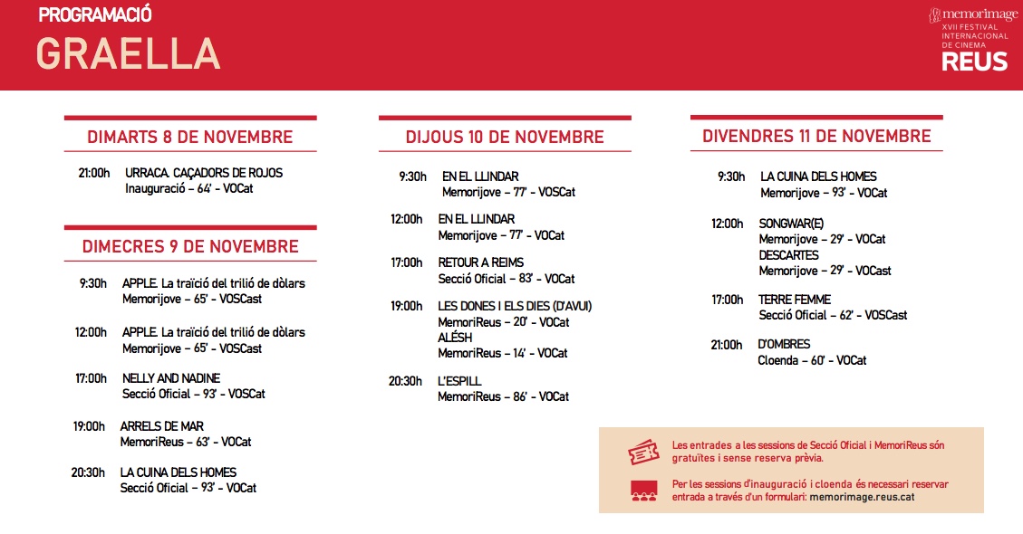 Projeccions amb entrada lliure. Cal fer reserva prèvia per les sessions d’inauguració i cloenda aquí (enllaç)