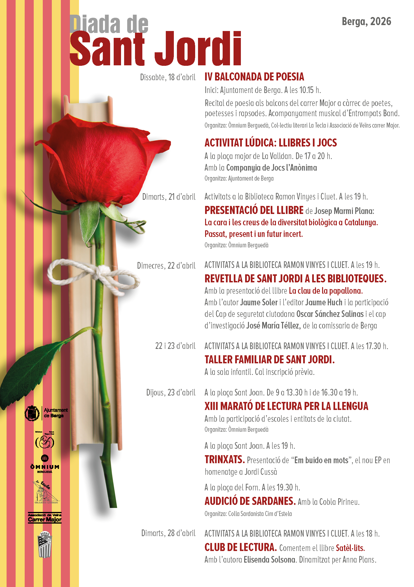 Berga celebra la Diada de Sant Jordi, i ho fa amb un programa farcit de propostes entre les que no hi faltaran les traicionals parades de venda de roses, llibres i altres productes relacionats amb la diada, l'13a edició de la Marató de Lectura per la Llengua, o l'audició de sardanes, enguany a càrrec de la Cobla Pirineu.