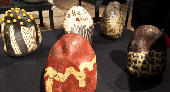 - I com és la teva obra ceràmica?F.P.: He seguit amb el meu llenguatge que potser és més conegut a partir de coses molt elementals i molt senzilles del paisatge humanitzat del Penedès. M’agraden les vinyes a l’hivern, els camps llaurats, els canyissars, les pedres de la riera... Tot d’elements que trepitgem amb els peus i que són la base de les meves obres al llarg dels molts anys que porto treballant. Són elements que modifico: d’això en faig una cal·ligrafia o un signe i és el mateix que he fet aquí amb la ceràmica. Alguns en forma de pedra, algun plat... Treballo més en el sentit escultòric que funcional. M’agradaria que el meu recorregut en la ceràmica fos escultòric. Per tant, segueixo treballant el meu llenguatge però en petites escultures.