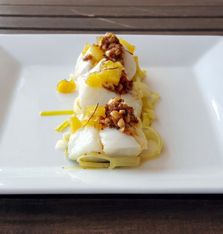 Pel bacallà confitat: 1 llom de bacallà al punt de sal, oli d’oliva, porro i 2 brins de safrà.