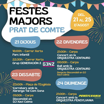 Nova edició de les Festes Majors de Prat de Comte, amb activitats per a tothom com nits de ball amb orquestra, gimcanes, àpats populars i activitats infantils, entre altres.