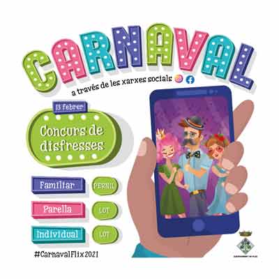 Concurs de disfresses de Carnaval. Animeu-vos a lluïr la vostra disfressa a través de les xarxes, ja sigui amb fotos o amb videos, etiquetant a l'@ajuntamentflix i afegint el hastag #CarnavalFlix2021 i podreu guanyar un premi de una de les 3 modalitats: - Familiar (pernil) - Parella (lot) - Individual (lot)