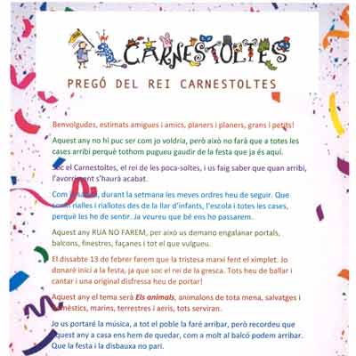 El Rei Carnestoltes demana al poble de Santa Bàrbara engalanar portals, balcons, finestres i façanes, i anima a ballar, cantar i disfressar-se a casa. Aquest any el tema serà Els animals, animalons de tota mena, salvatges i domèstics, marins, terrestres i aeris.