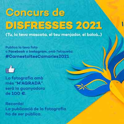 Disfressa't o disfressa la teva mascota o engalana el teu balcó, casa, habitació.... i publica les fotos a Facebook o Instagram amb l'etiqueta #CarnestoltesCamarles2021. La foto que aconsegueixi més "m'agrada" s'emportarà 100 euros.