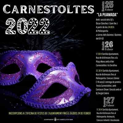 Dissabte 26 de febrer: 17:30h | Sortida Ajuntament Rua de disfresses fins a la Plaça Nova amb el Rei Carnestoltes i la Serafina 22:30h | Sortida Ajuntament Rua de disfresses fins al Poliesportiu: Concurs Sènior (+14 anys) i entrega de premis Festa Carnestoltes amb Centauro Show i Sessió amb el Dj Sergio Calero