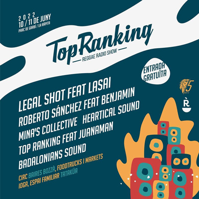 5a edició del Top Ranking Festival, el festival de la bona vibra, la casa de totes vatros, lo cap de la setmana de la germanor i la bona companyia. Amb dos dies de música en directe, tallers infantils, graffitis i market, entre altres activitats, al Parc de Garbí.