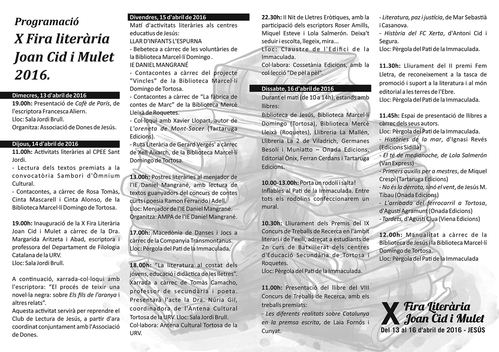 Desena edició de la Fira Literària Joan Cid i Mulet de Jesús, amb tres dies d'activitats diverses (presentacions de llibres, conferències, contacontes, lectures en veu alta, etc..) al voltant dels llibres i la literatura.