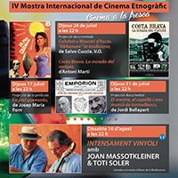 La IV mostra internacional de Cinema Etnogràfic, comptarà amb dues sessions més de cinema a la fresca gratuïtes al Museu de la Mediterrània, el dijous 24 de juliol, amb la projecció dels documentals: 'Calafati e Maestri d'Ascia. Abbonare" la tradizione', de Salvo Cuccia. V.O. i ¡Costa Brava. La mirada del viatger', d'Antoni Martí. I el dijous 31 de juliol, amb la projecció documental: 'El mestre, el capellà i una munió de torroellencs', de Jordi Bellapart, ambdós dies a les 22:00 h del vespre.