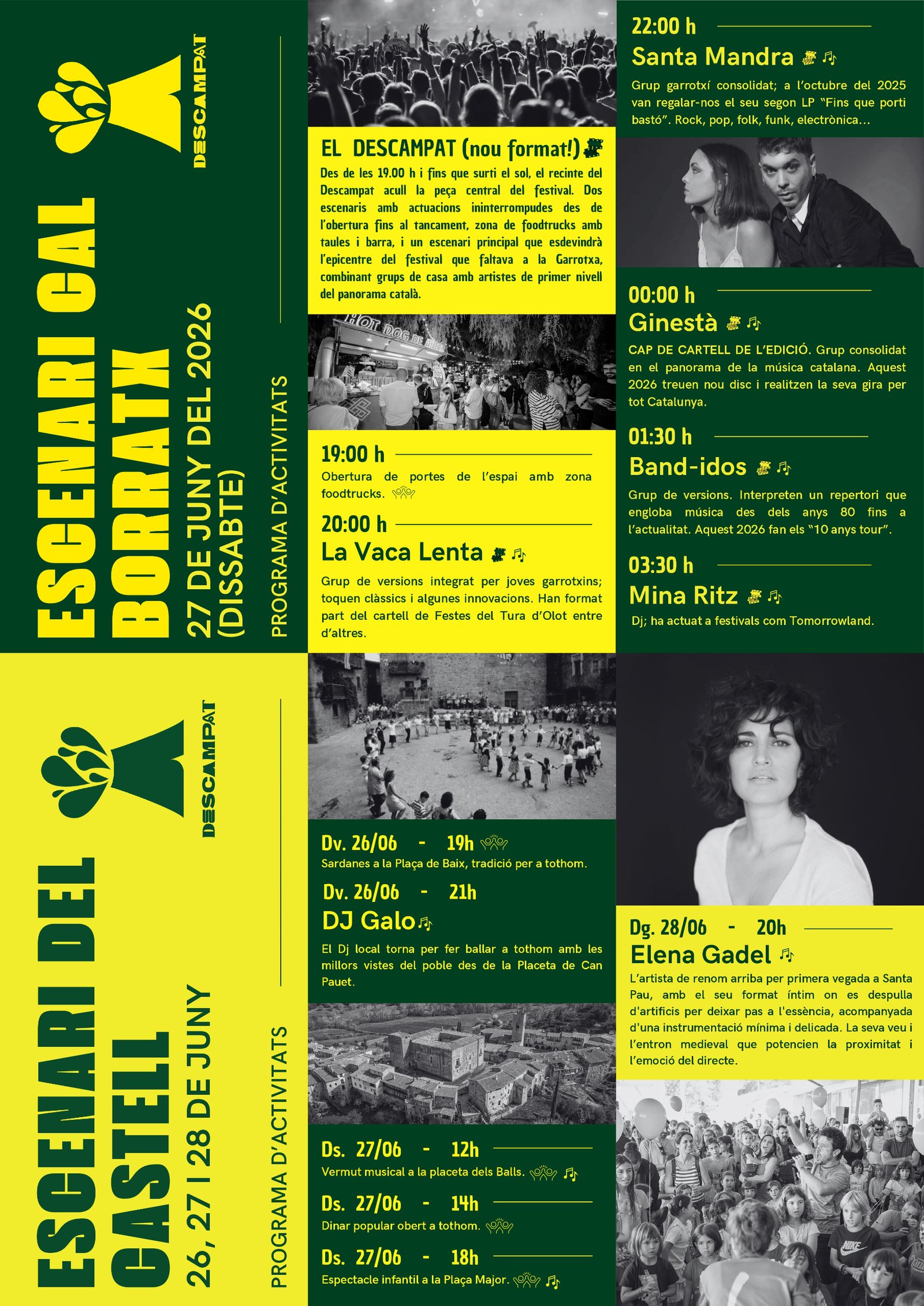 Dissabte 27 de juny:Escenari Cal Borratx (Pàrquing del Pavelló) 20:00h | La Vaca Lenta 22:00h | Santa Mandra 00:00h | Ginestà 01:30h | Band-idos 03:30h | Mina Ritz