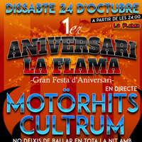 Gran Festa del primer aniversari de la sala de festes La Flama. Els seus responsables ens han preparat una nit màgica de concerts en directe i ball amb DJ’s fins a la matinada: Sorpresas Motörhits + Cultrum (presentació nou disc) + Els 4 Magnífics (Sessions Dj’s). El nostre company Marc Guitart parlava amb els impulsors de La Flama el desembre passat. Podeu llegir l'article aquí.