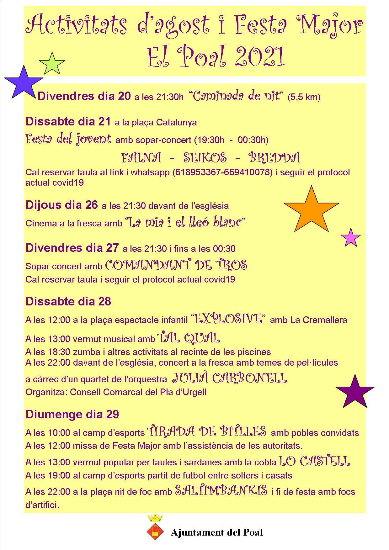 El Poal celebra la tant esperada Festa Major que, tot i que encara estarà marcada per les restriccions de la Covid-19, oferirà un seguit d'actes que ompliran el carrers de la vila de molta gresca, que començarà amb la nit del jovent.