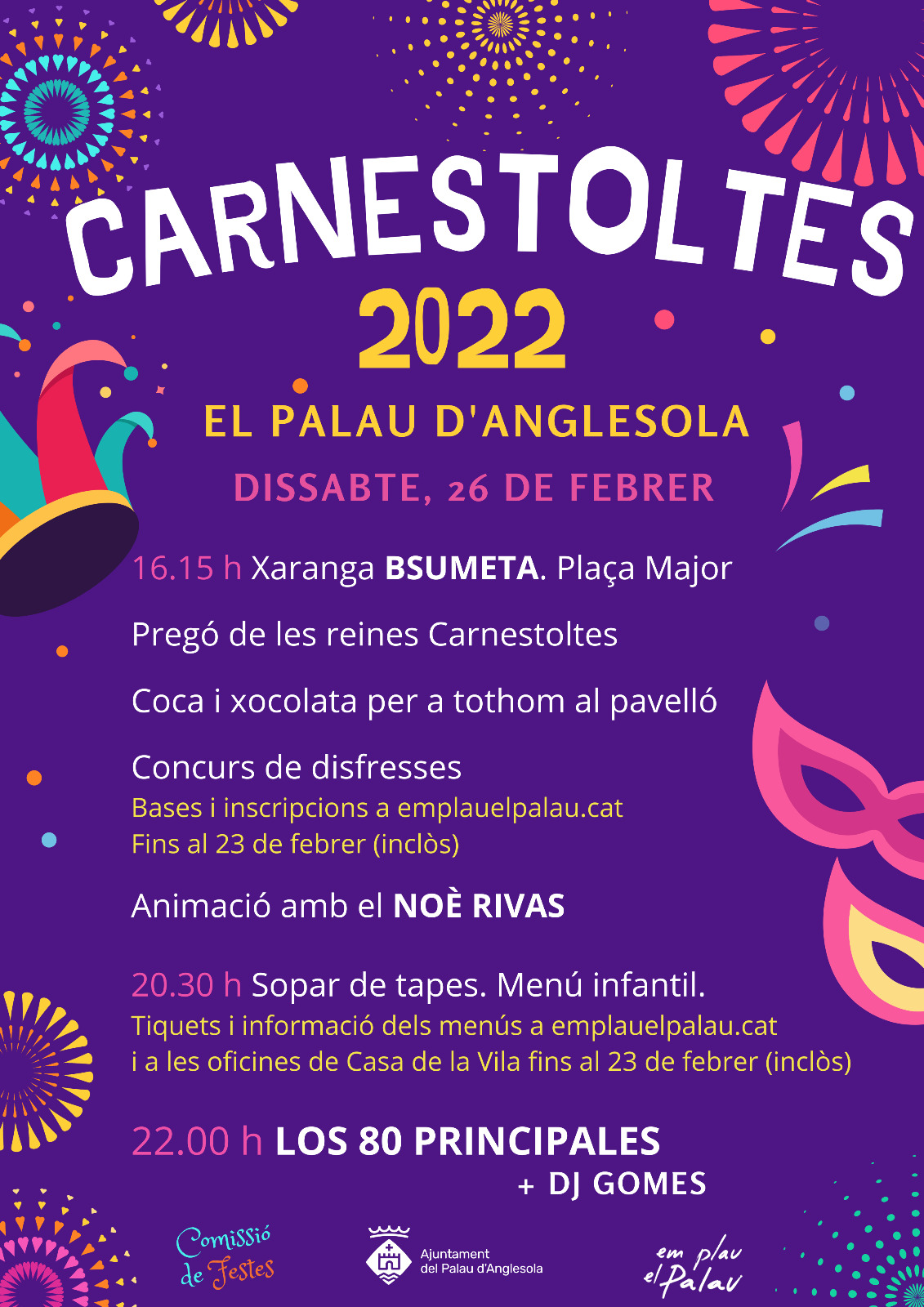 16:15h | Plaça Major: Pregó de les reines Carnestoltes amb la xaranga Bsumeta Tot seguit, al Pavelló: Coca i xocolata per a tothom + Concurs de disfresses 20:30h | Sopar de tapes 22:00h | Pavelló: Nit de carnestoltes amb L80P + DJ Gomes