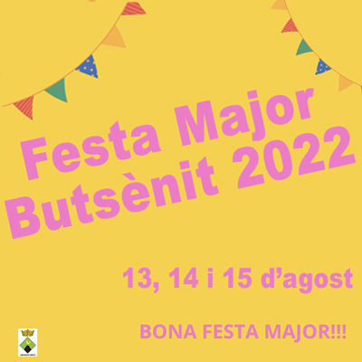 Dilluns 15 d'agost: 11:00h | Missa solemne 12:00h | Xerrada sobre les Muralles de Butsènit 17:00h | Taller de Circ 18:30h | Partit de futbol infantil Butsènit - Montgai 20:00h | Ball de tarda-nit amb Zarabanda