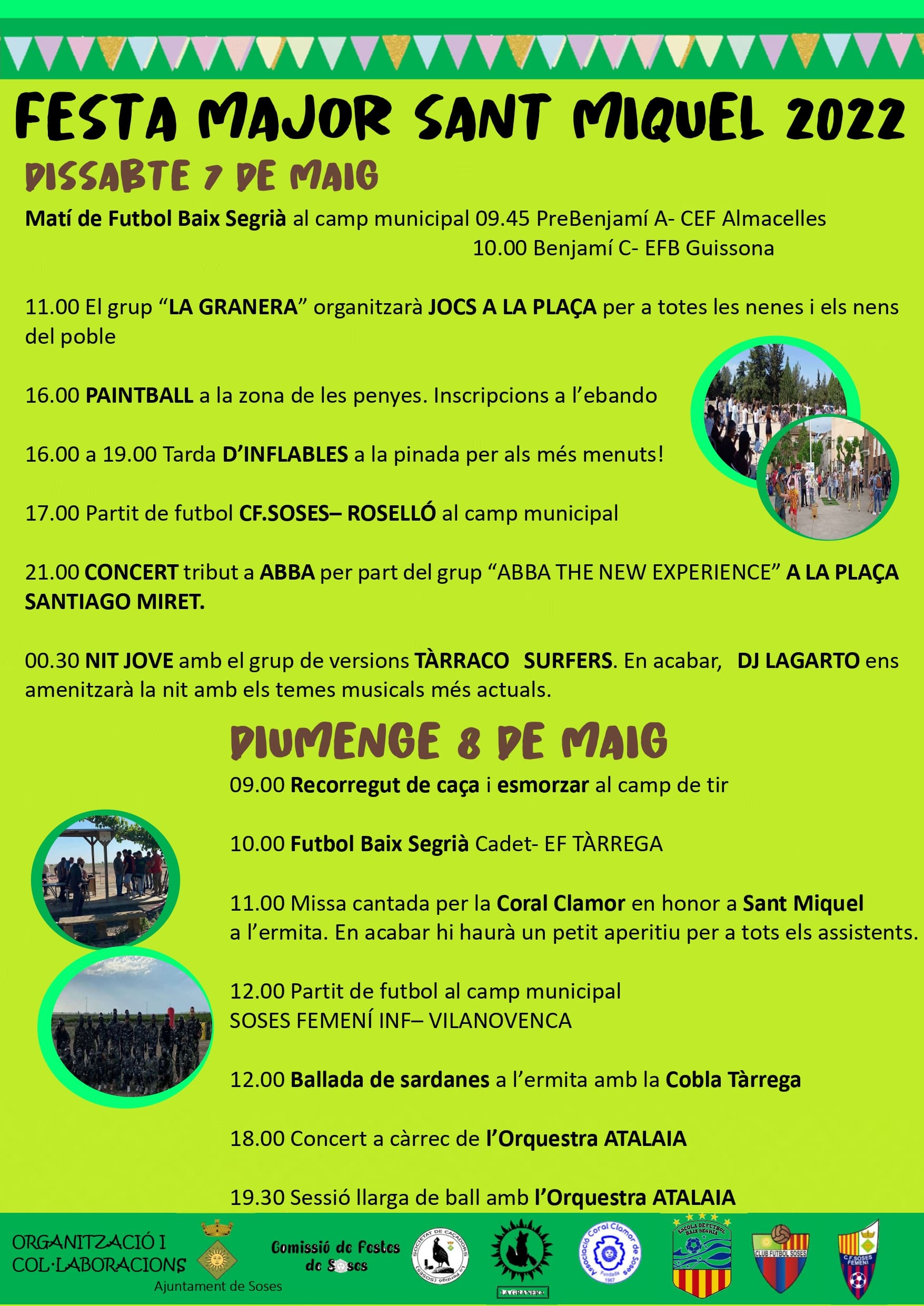 Dissabte 7 de maig: 09:00h | Camp municipal: Mati de Futbol Baix Segrià 11:00h | Jocs a la Plaça amb el grup La Granera 16:00h | Zona de les Penyes: Paintball De 16 a 19h | Pinada: Tarda d'inflables per als més menuts 17:00h | Camp municipal: Partit de futbol CF. Soses - Roselló 21:00h | Plaça Santiago Miret: Concert d'ABBA the New Experience 00:30h | Nit Jove amb els Tàrraco Surfers + Dj Lagarto
