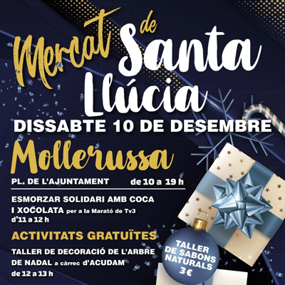 En el marc de les Festes de Nadal a Mollerussa, nova edició del tradicional Mercat de Santa Llúcia, on els i les assistents podran passejar, adquirir elements nadalencs com avets de Nadal o figuretes del pessebre, o gaudir d'activitats com la xocolatada solidària a favor de La Marató de tv3.
