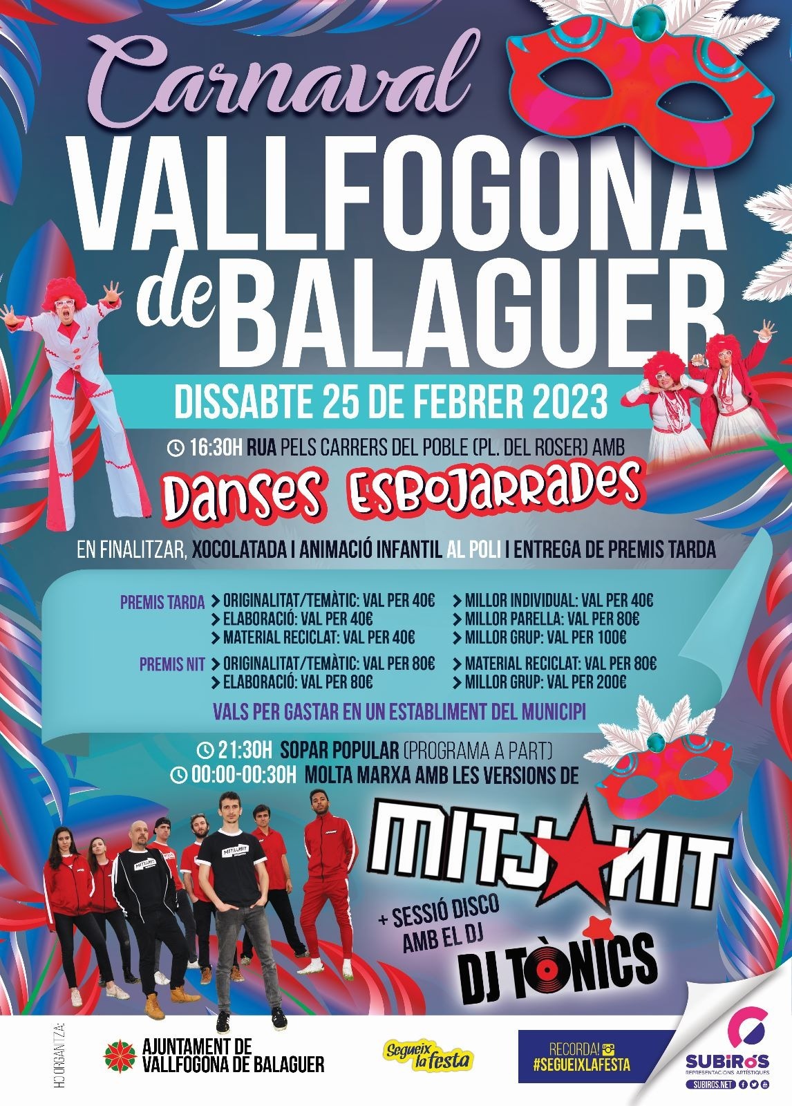 16:30h | Rua de Carnestoltes 21:30h | Pavelló: Sopar popular 24:00h | Concert del grup de versions Mitjanit + Dj Tònics