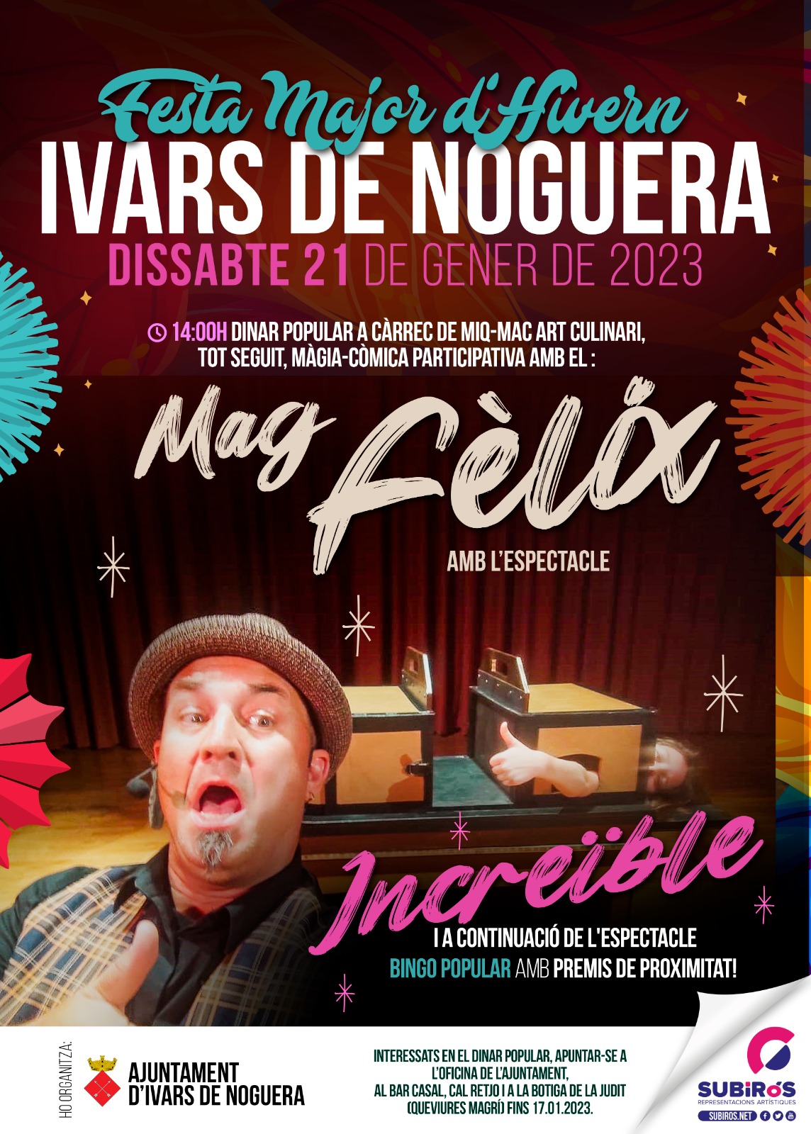 Ivars de Noguera la seva Festa Major d'Hivern, i ho fa amb un gran dinar seguit de l'espectacle de màgia còmica a càrrec de Fèlix Brunet.