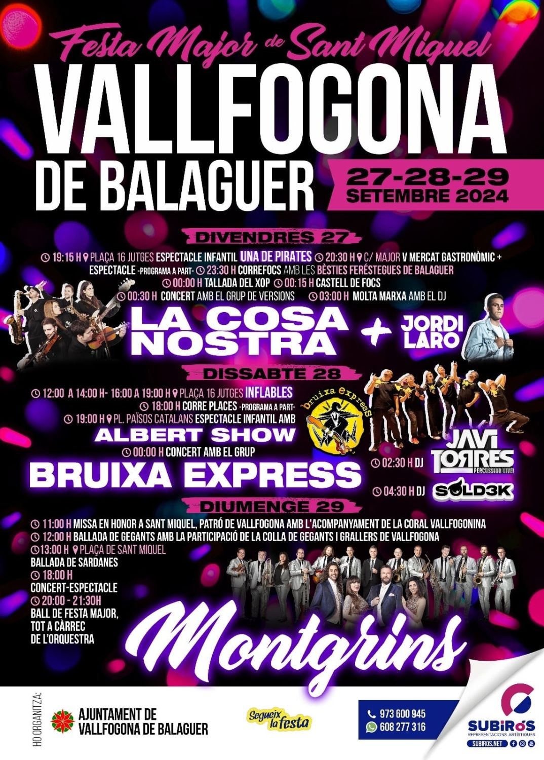 Vallfogona de Balaguer celebra la seva Festa Major de Sant Miquel, i ho fa amb un programa farcit de propostes entre les que no hi faltaran espectacles familiars, el tradicional correfocs, la 5a edició del Mercat Gastronòmic, o les esperades revetlles, enguany amb les actuacions de grups com La Cosa Nostra, Bruixa Express o l'Orquestra Montgrins.
