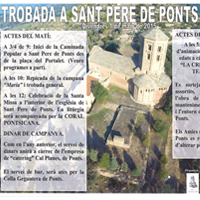 08:45h Inici de la caminada popular a Sant Pere de Pont des de la plaça del Portalet 10:00h Repicada de la campana 'Maria' i trobada general 12:00h Celebració de la Santa Missa a l'interior de l'església de Sant Pere. La litúrgia serà acompanyada per la CORAL PONTSICANA Dinar de campanya. Com en l'any anterior el servei de dinars anirà a càrrec de l'empresa Cal Planes. 17:00h Espectacle d'animació per a totes les edats a càrrec del grup 'La cremallera teatre'. Es sortejaran tres lots a benefici de l'obra de restauració i manteniment de l'esglèsia i l'entorn de Sant Pere de Ponts.