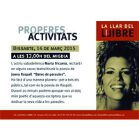 L'actriu sabadellenca Marta Tricuera recitarà i teatralitzarà poemes de Joana Raspall, sobretot del seu llibre 'Batec de paraules'. A l'igual que els poemes de Raspall serà un espectacle pensat perquè en gaudeixin tots els públics.