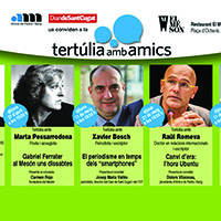 El restaurant El Mesón de Sant Cugat proposa un seguit de xerrades i debats a càrrec de personalitats pertanyents al món cultural. Escriptors, poetes o periodistes ens parlaran de les seves obres, de la seva visió envers certes situacions i de les seves opinions en relació a temes concrets i d'actualitat. Convidaran, també, a participar-hi activament i a que tothom hi digui la seva. Tertúlies acompanyades sempre d'un bon berenar. Ja se sap que és difícil pensar i discutir amb la panxa buida.